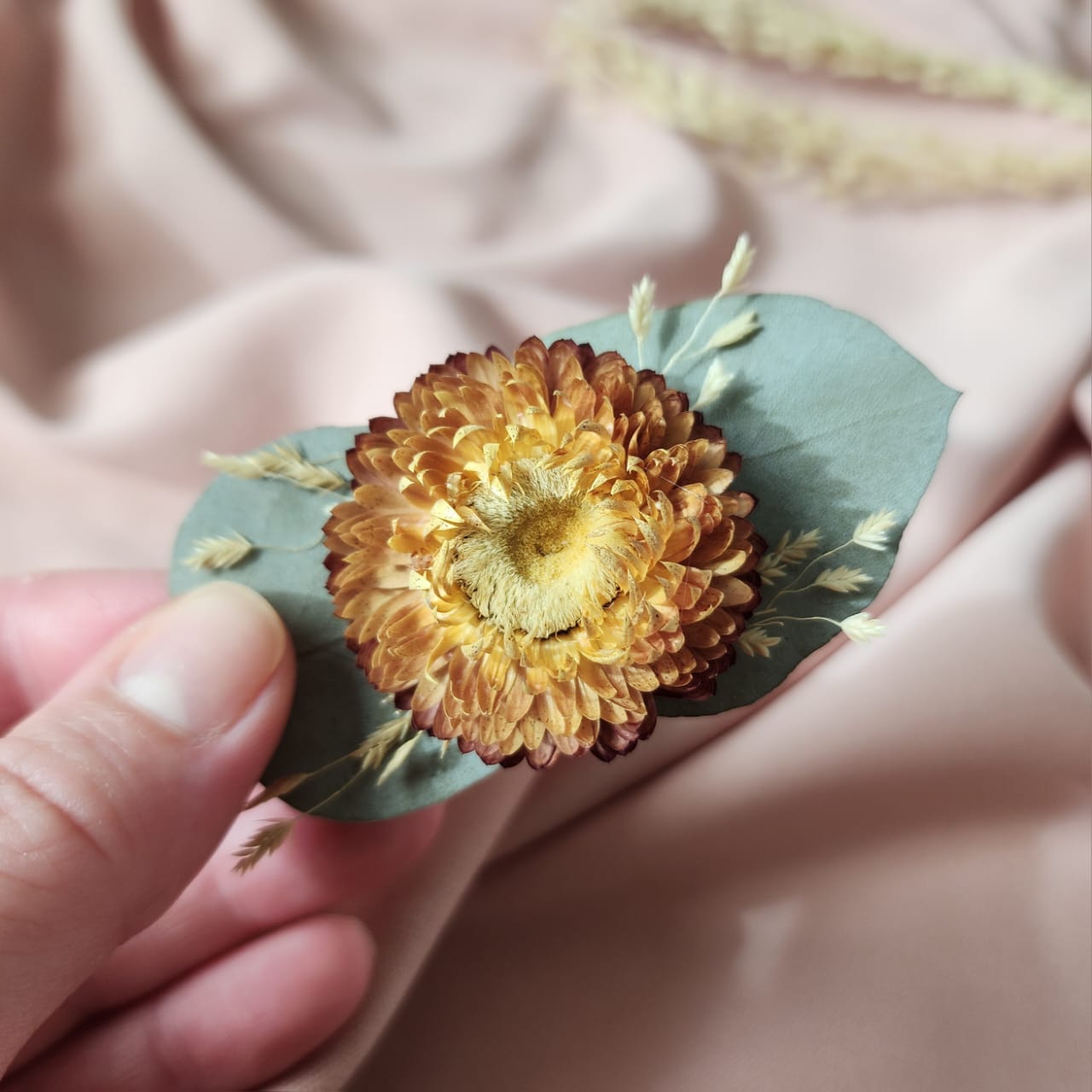 Feito à mão com flores e folhagens naturais desidratadas.