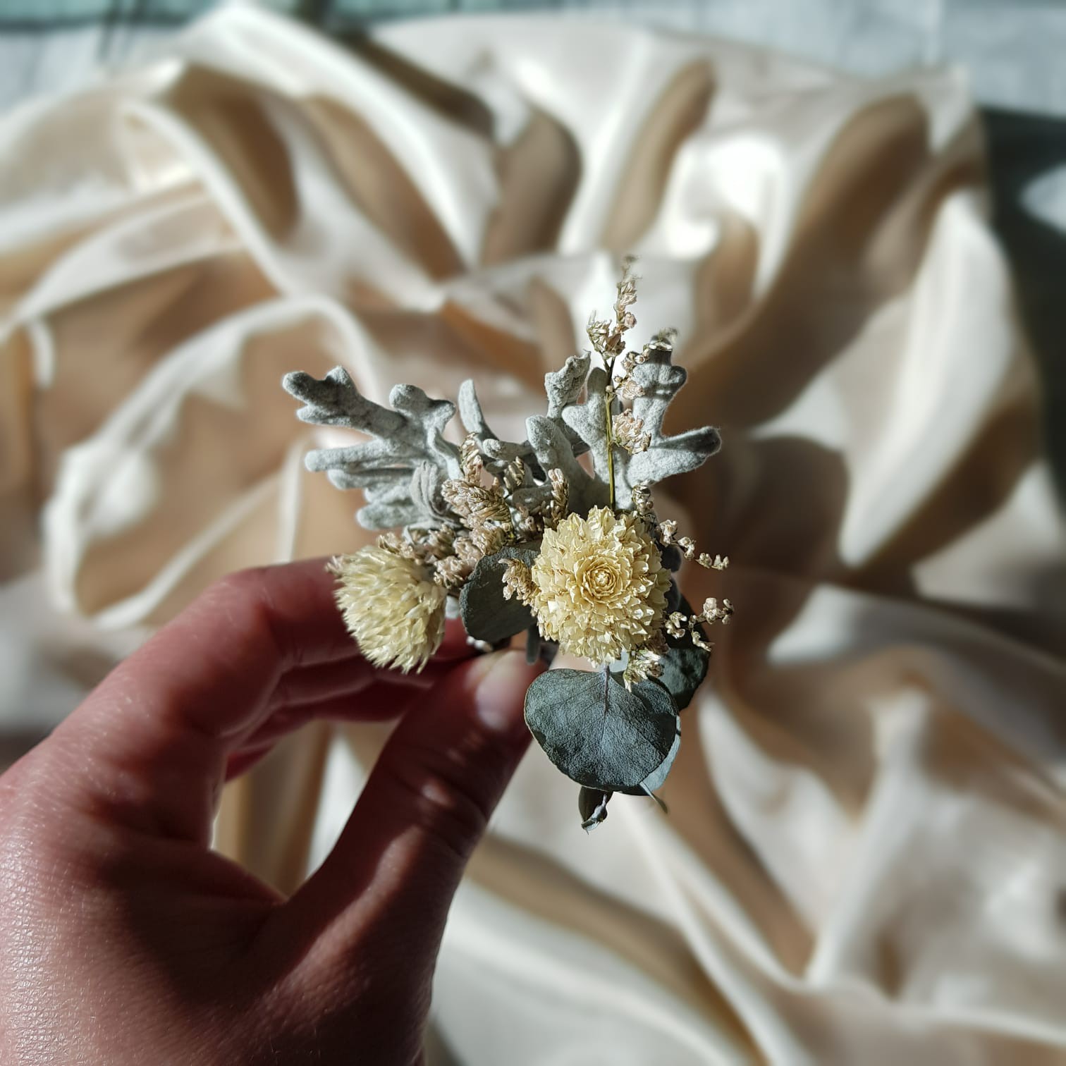 Feito à mão com flores e folhagens naturais desidratadas.